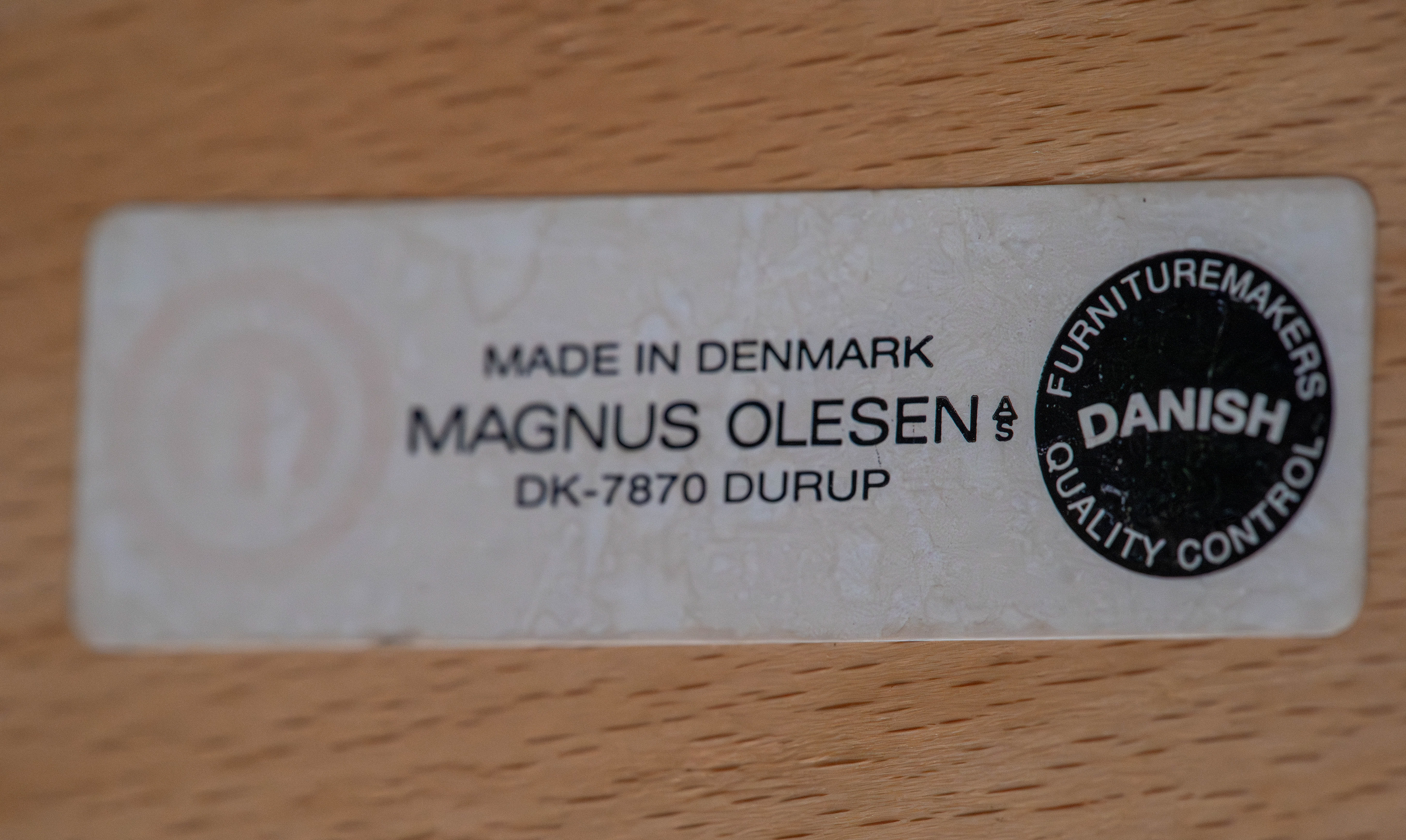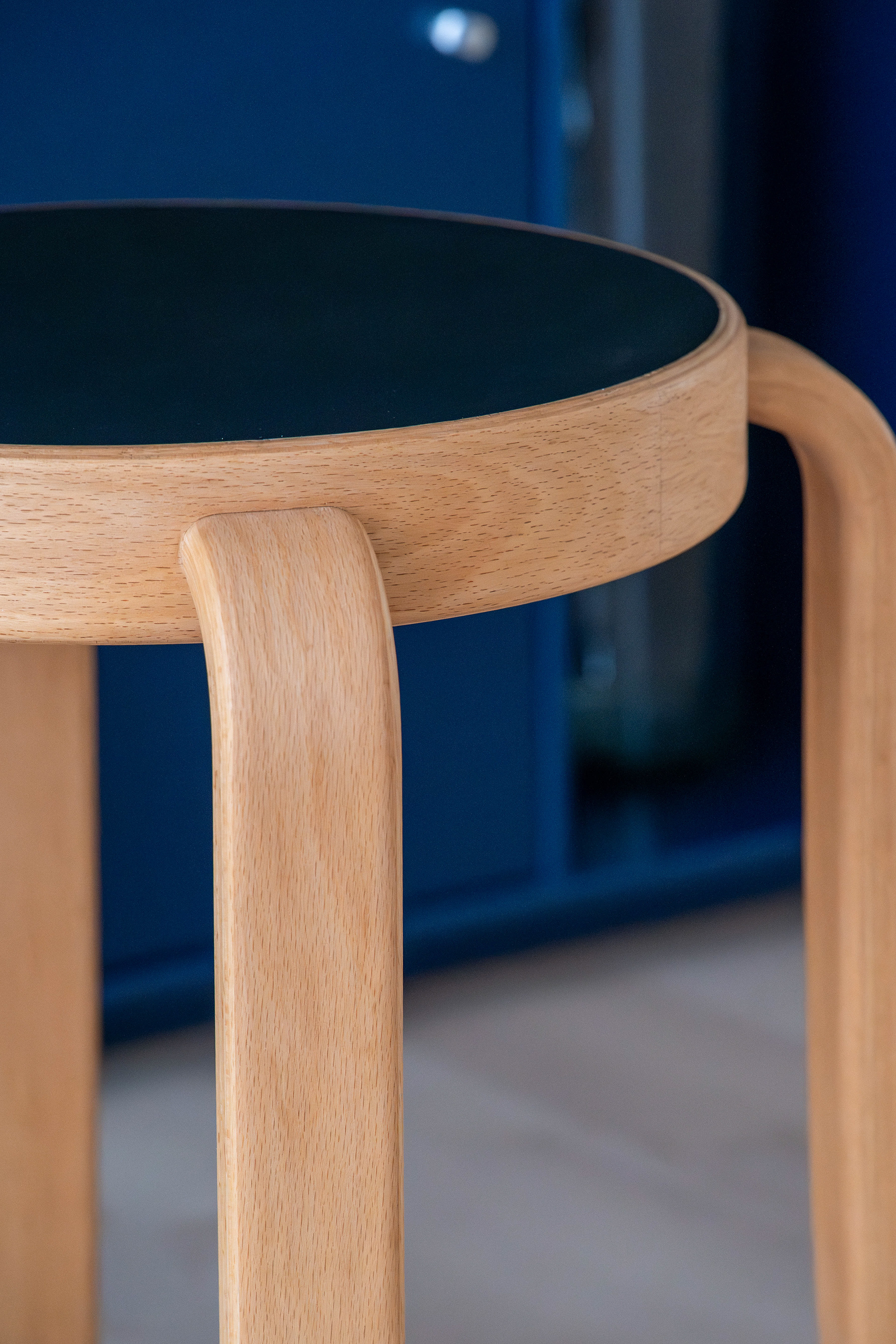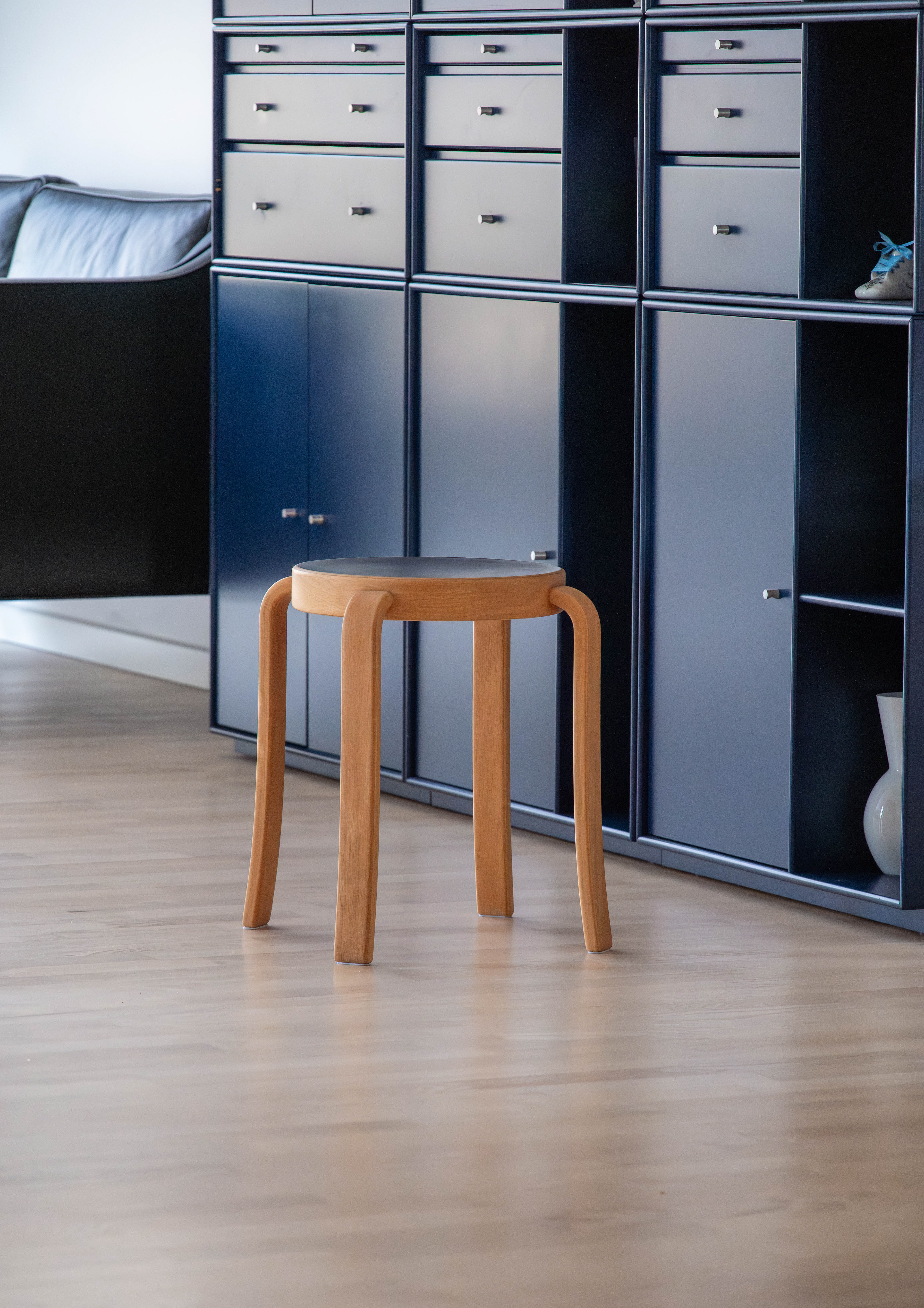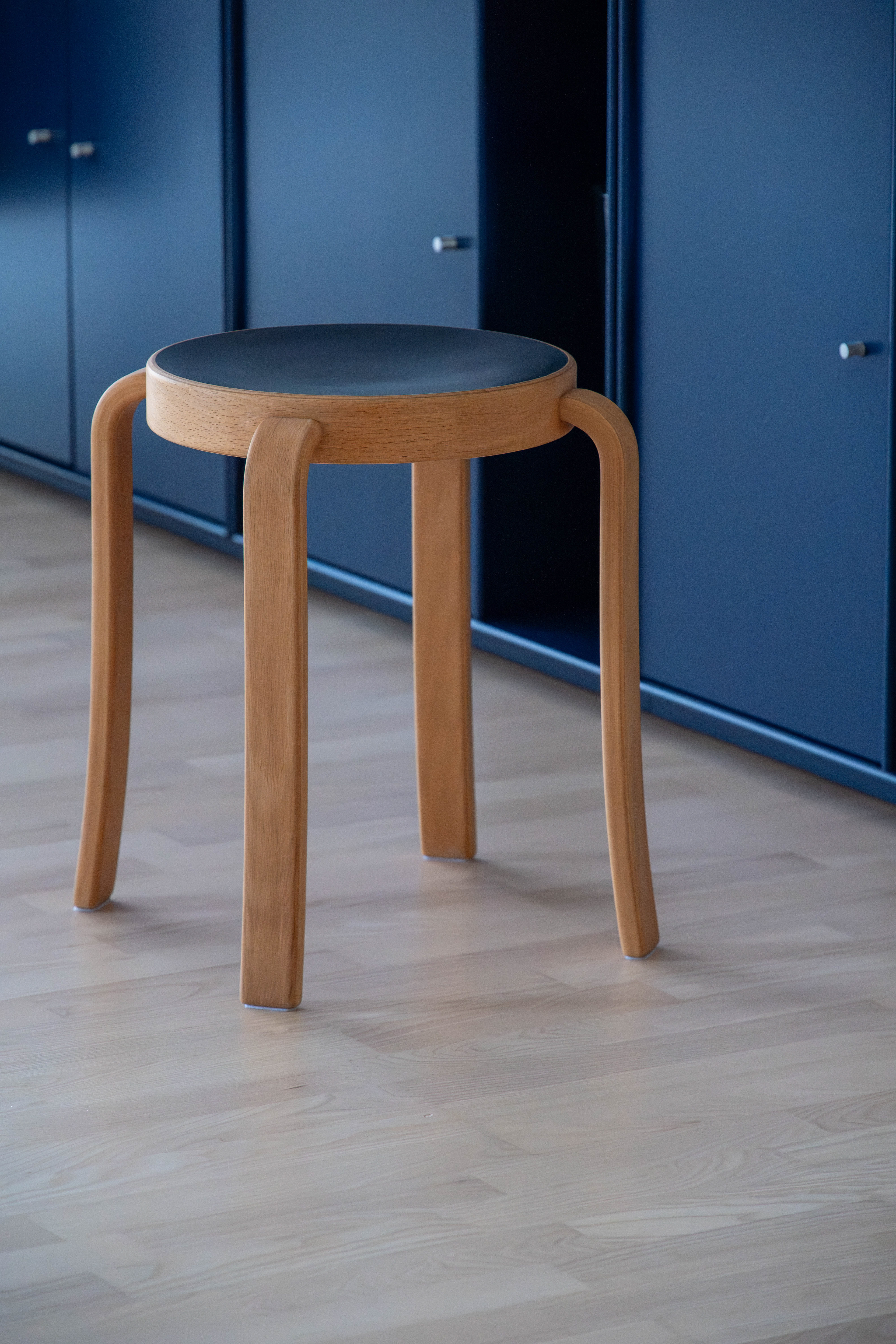 The stool has been refinished with hardwax oil and shows small signs of use and patina. The original finish is lacquer and appears more glossy. The hardwax oil has the advantage that it can easily be removed and another finish can be applied to match e.g. an existing set with original finish. Besides refinishing the stool, it has also been bleached to remove small areas with water damage.