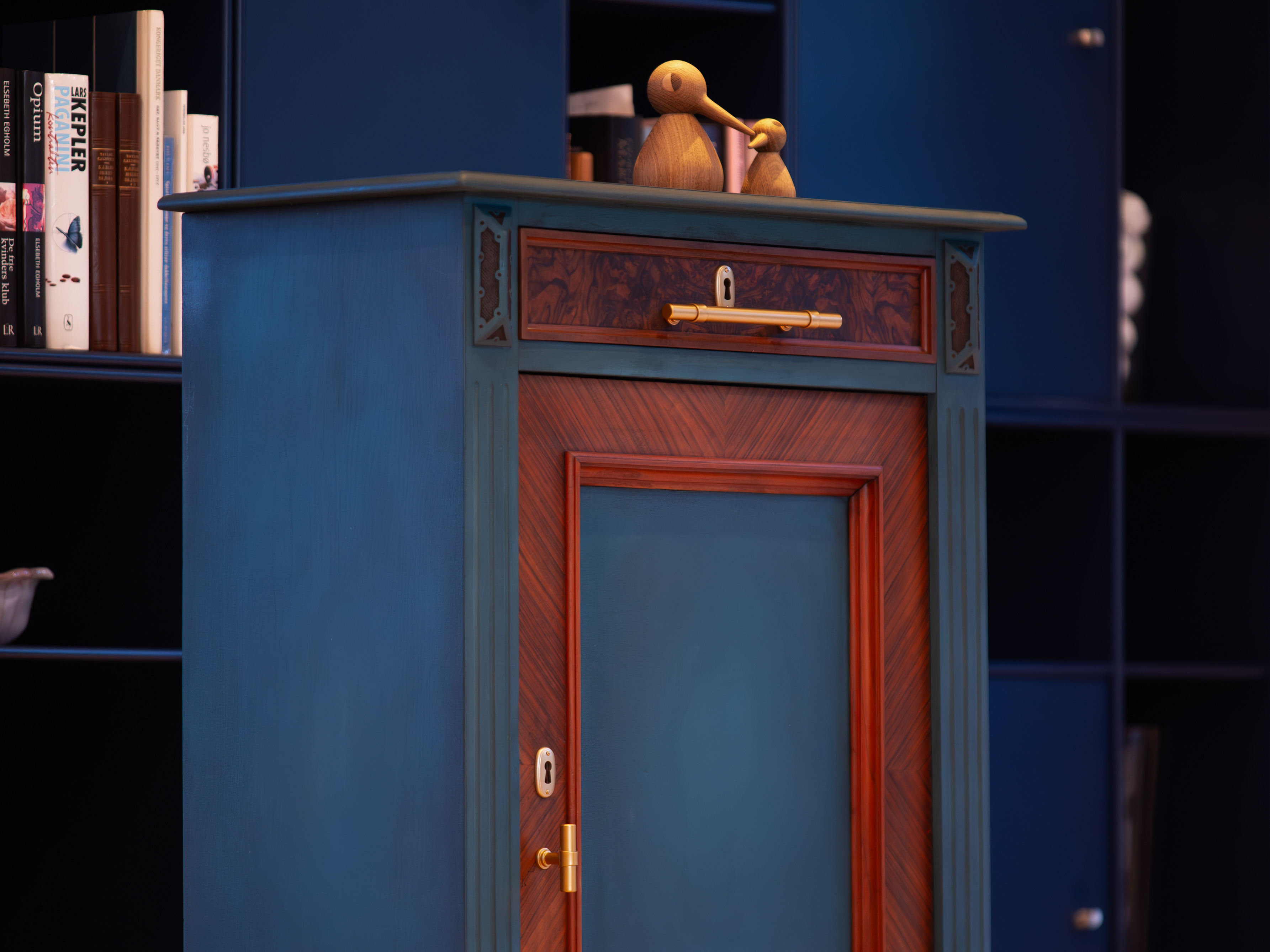The tables are made from an old desk with the sides renovated and painted over with grey/antacrite. The table top and legs have been fitted afterwards and a couple of keys with a suitable patina have been purchased.