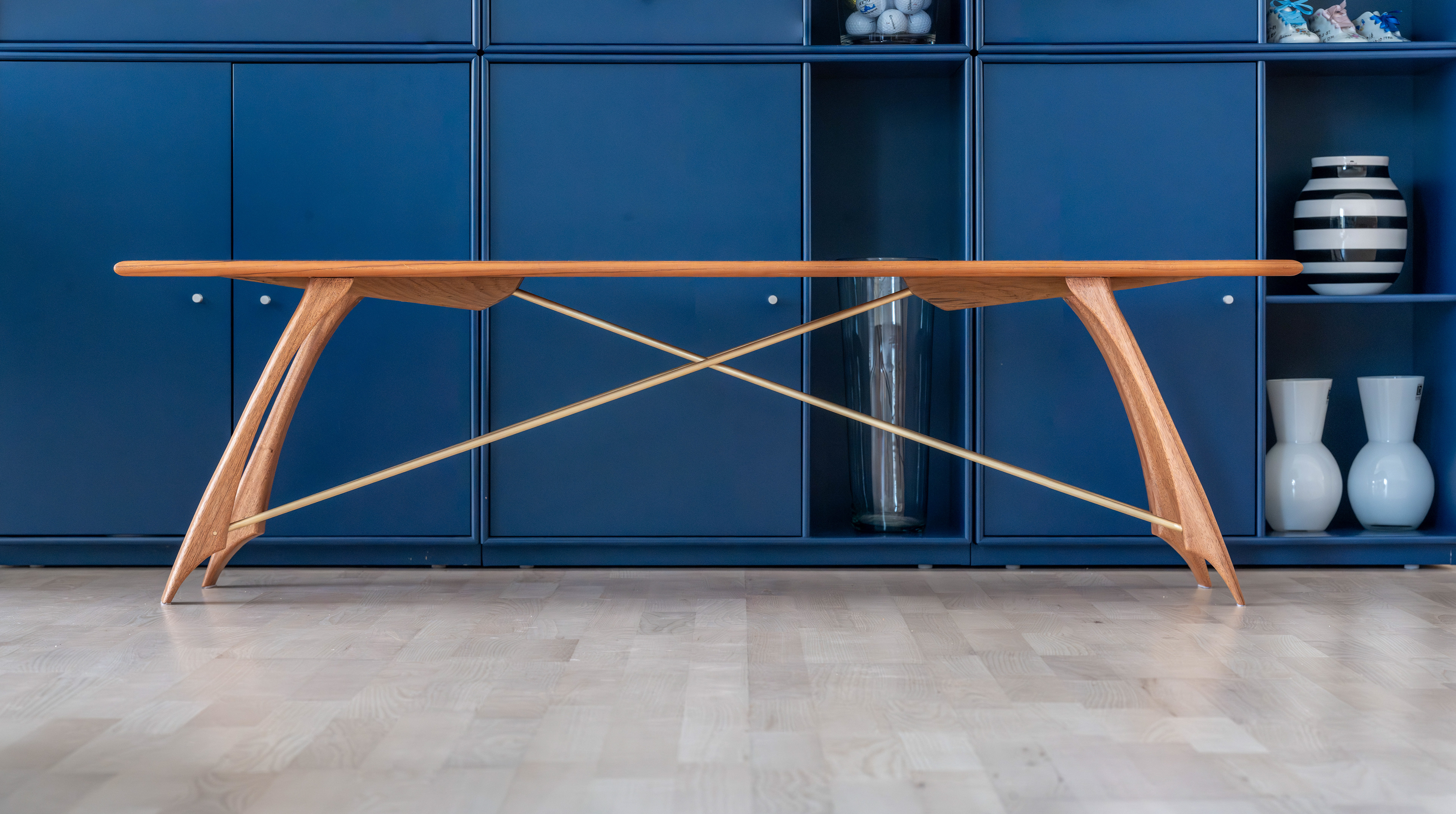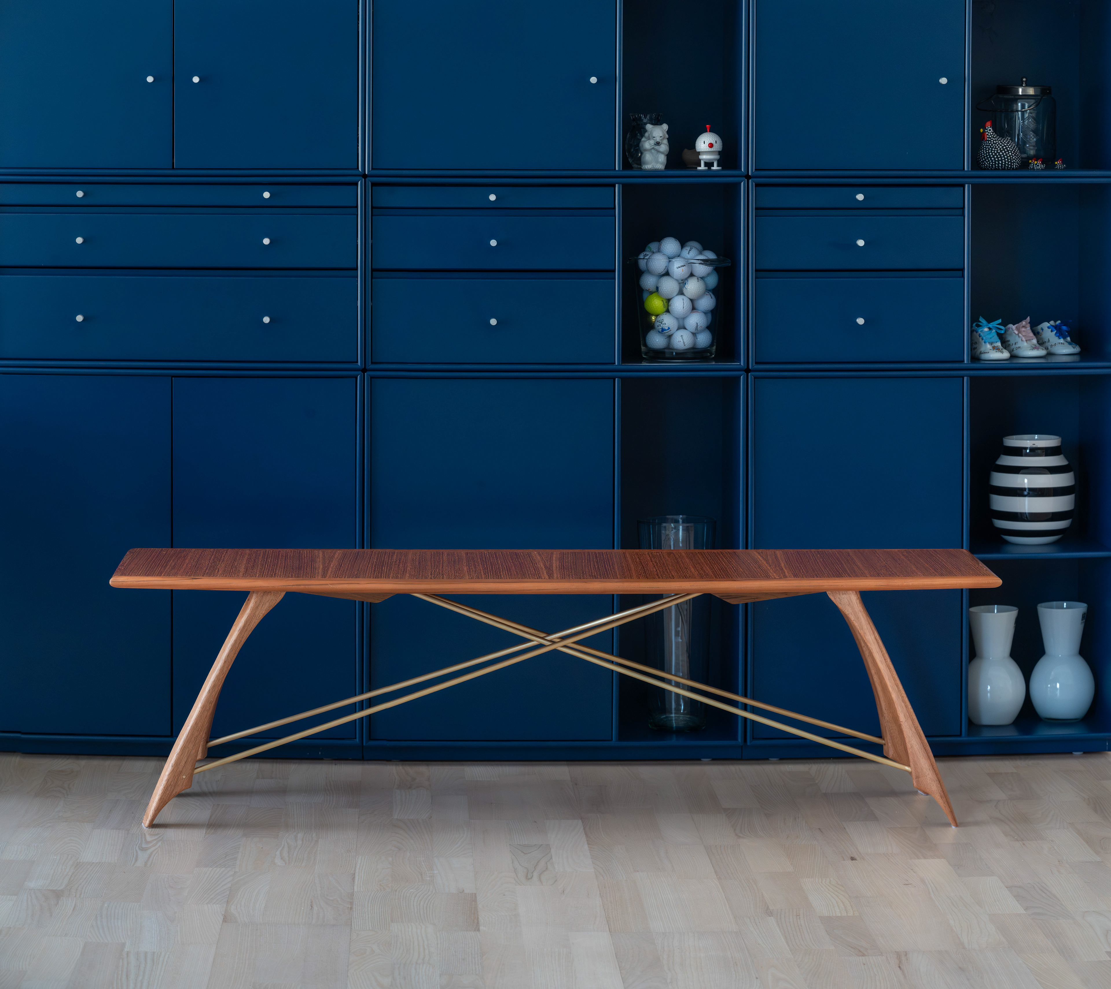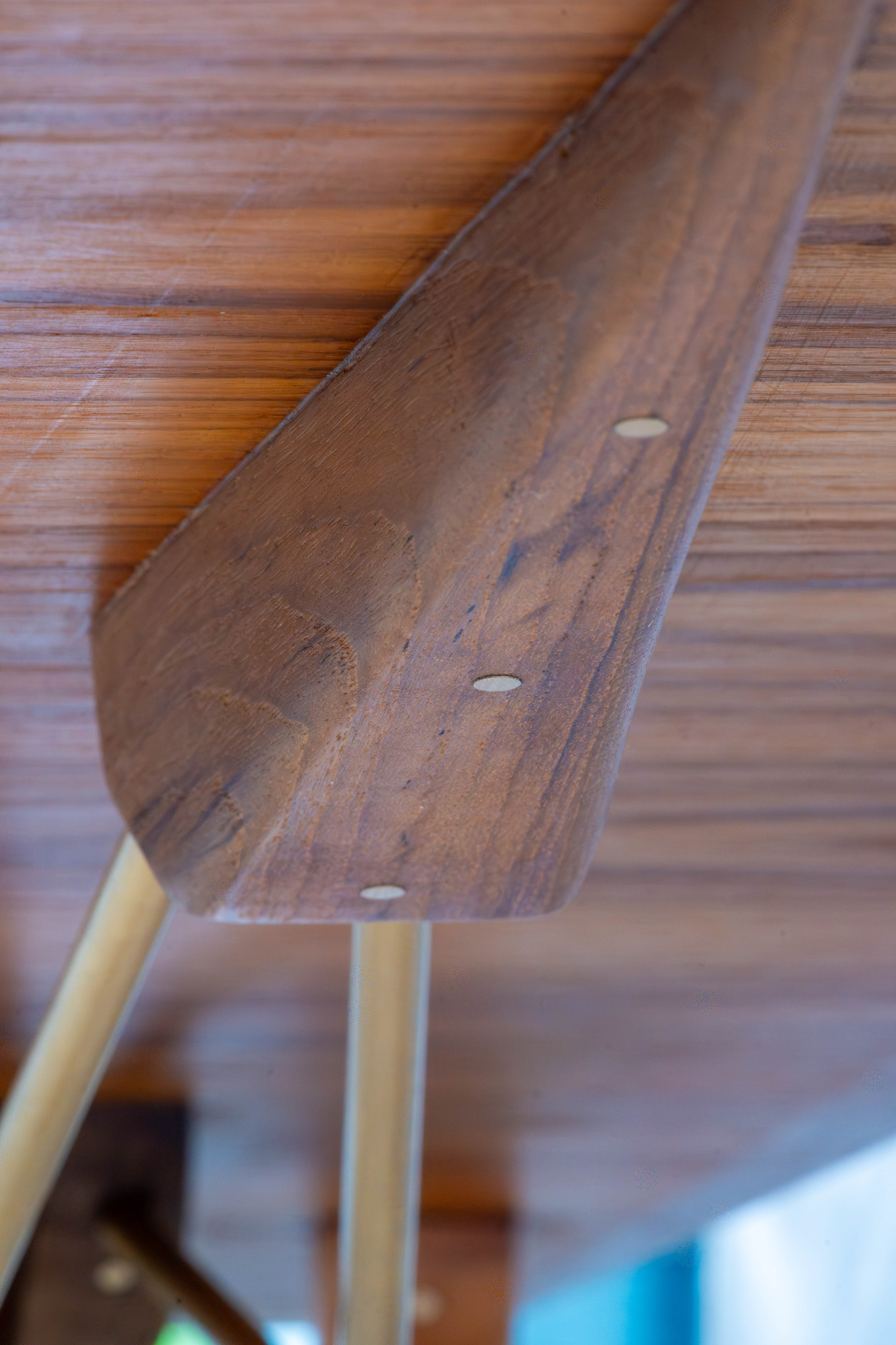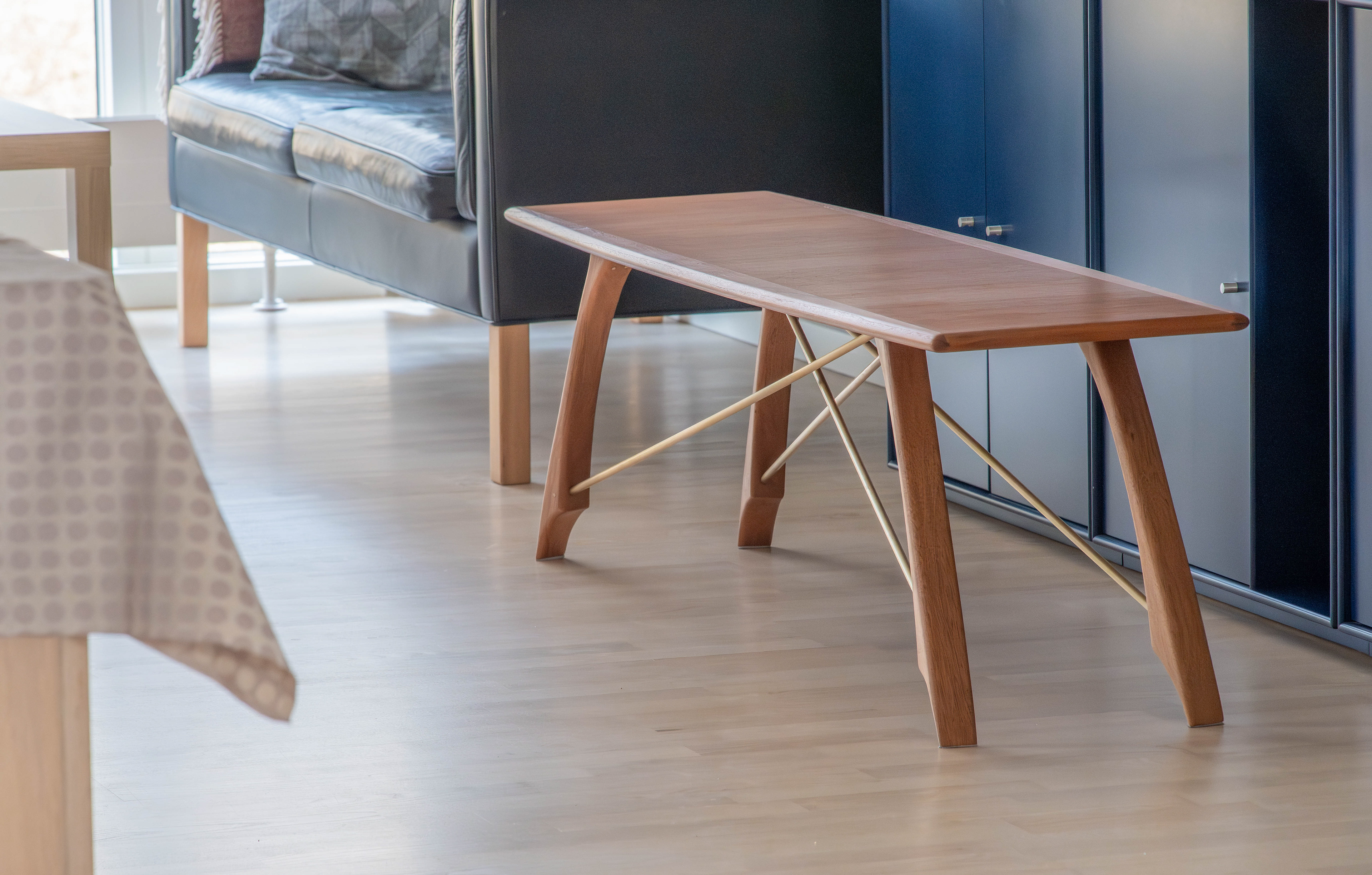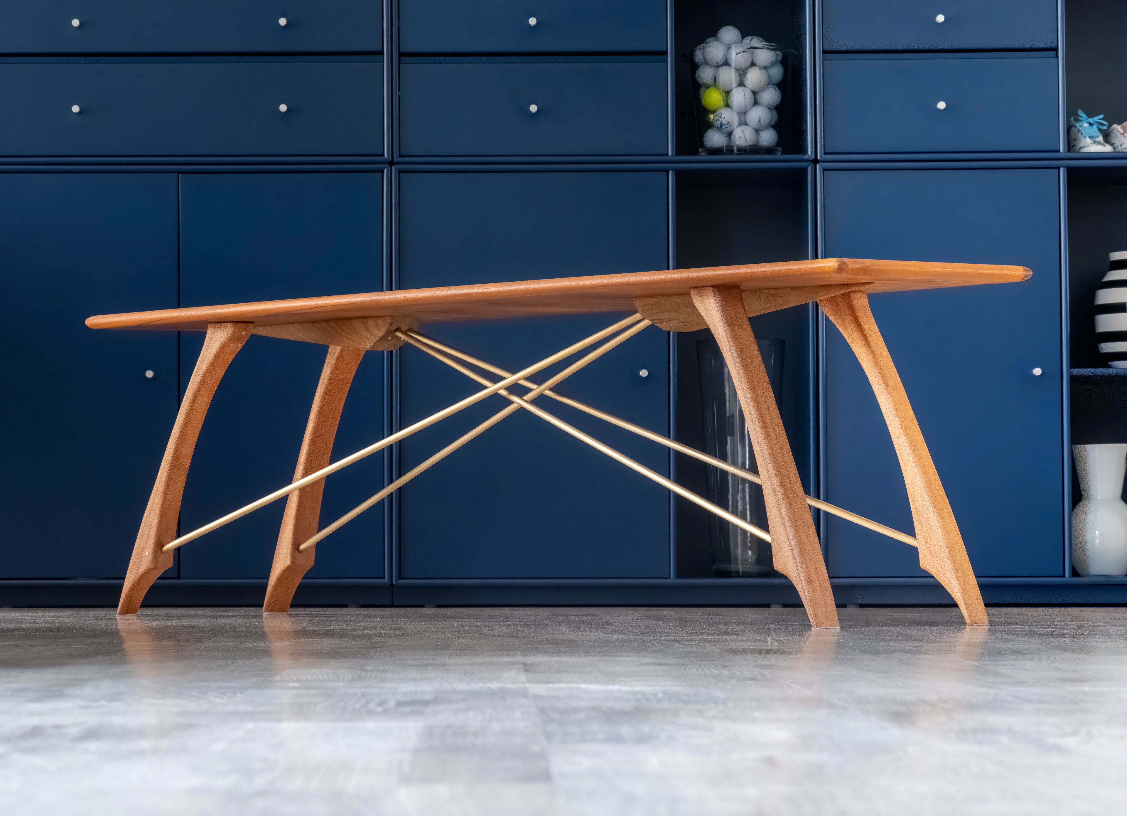 A unique handcrafted bench of my own design. The seating area has been repurposed from the headrest of an old midcentury teak bedframe. This piece of wood fell into my lap by coincidence and I could not refuse to use it for a somewhat original piece. The seat is supported by four legs in solid mahogany with a distinctive midcentury/modern design and the assemply is supported with brass rods and 26 brass dowels to lock everything together. Small repairs have been made with brass inlays and the whole thing has been finished with a hardwax oil.